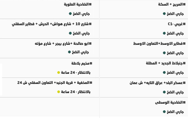 جدول توزيع المياه لليوم الاثنين 27-4-2020