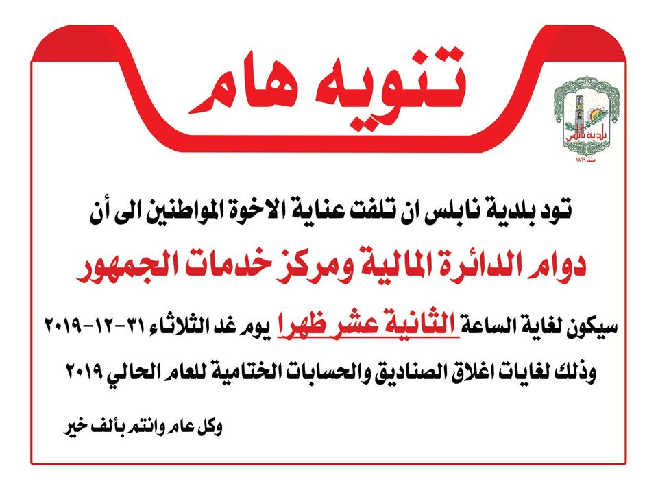 تنويه بخصوص دوام الدائرة المالية ومركز الخدمات الجمهور