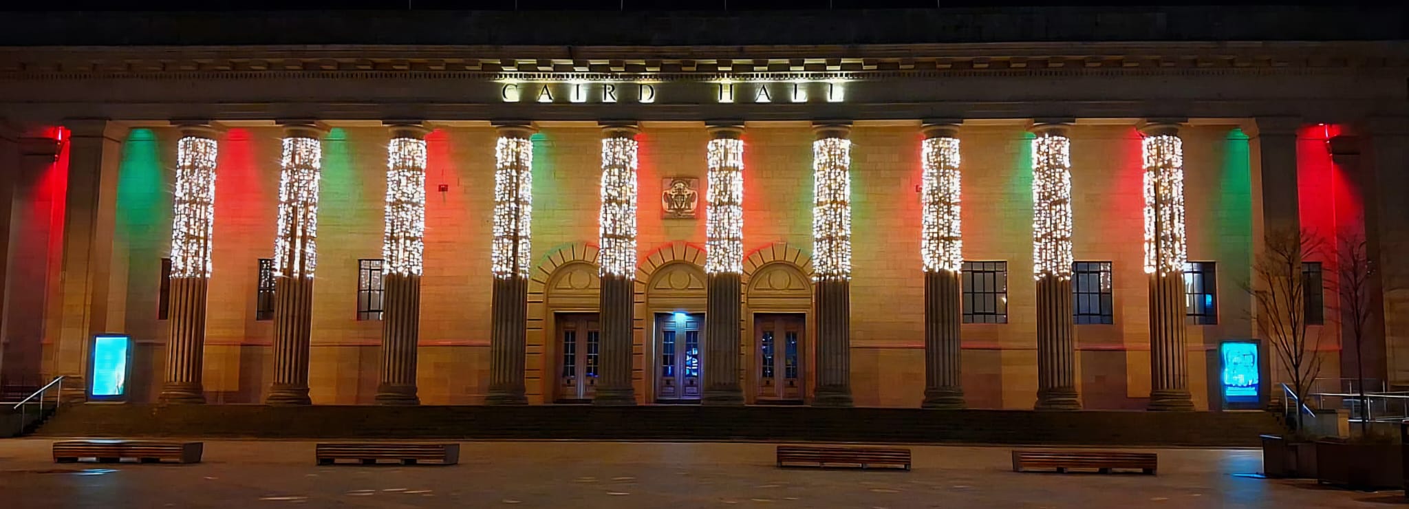 مبنى السير (جيمس كيرد)، وهو مبنى الفعاليات والمناسبات الرسمية في مدينة دندي يزدان بألوان العلم الفلسطيني استعدادا للاحتفال بذكرى مرور 45 عاما على توقيع اتفاقية التوأمة بين المدينة الاسكتلندية ونابلس.