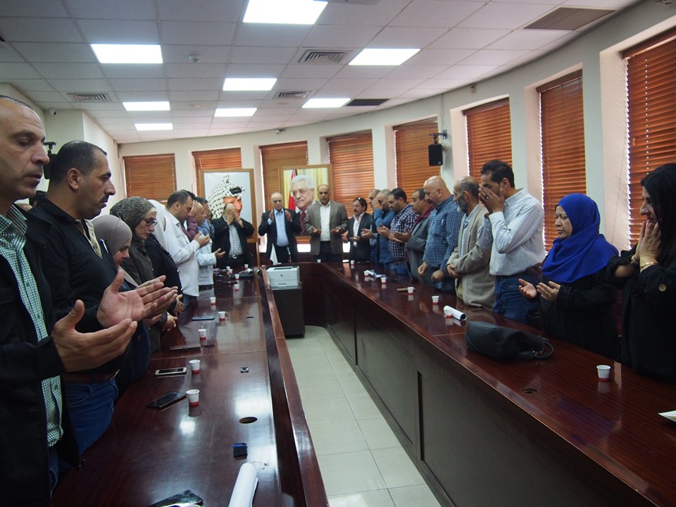 افتتح المهندس سميح طبيلة رئيس بلدية نابلس لقاءه مع نقابة العاملين في بلدية نابلس بقراءة الفاتحة على روح شهيد بسط النظام وازالة التعديات فراس عصام الشايب، عقب الوقفة التضامنية التي نظمتها نقابة العاملين في بلدية نابلس احتجاجاً على اطلاق النارعلى طواقم البلدية والأجهزة الأمنية وذلك بحضور السيد جهاد رمضان أمين سر حركة فتح وعضو الاقليم السيد سعيد الزبيدي وعضوي المجلس البلدي الدكتور غسان المصري والسيدة سماح الخاروف والسيد ضرار طوقان رئيس نقابة العاملين في البلدية وأعضاء النقابة.