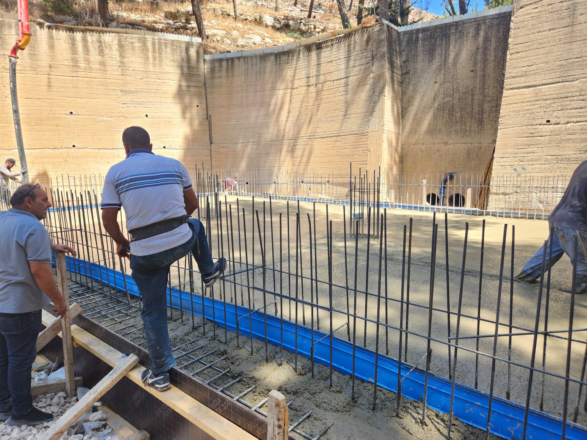 جانب من تفقد رئيس بلدية نابلس الدكتور سامي حجاوي ومدير الدائرة الهندسية المهندس سائد سالم صباح اليوم، سير الأعمال الإنشائية في مشروع خزان مياه البادان، بتمويل من صندوق البلدية وبتكلفة 850 الف شيكل.