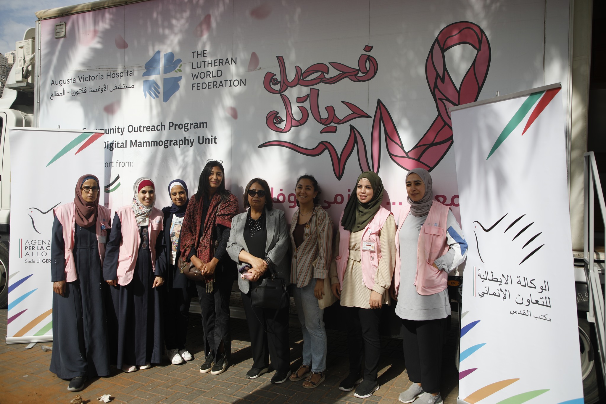 بمناسبة شهر أكتوبر الوردي، نظمت العيادة المتنقلة التابعة لمستشفى المطلع في القدس بالتعاون مع بلدية نابلس يوم أمس الأربعاء فعالية للكشف المبكر عن سرطان الثدي من خلال إجراء الفحوصات السريرية والفحص الاشعاعي (تصويرالماموجرام).