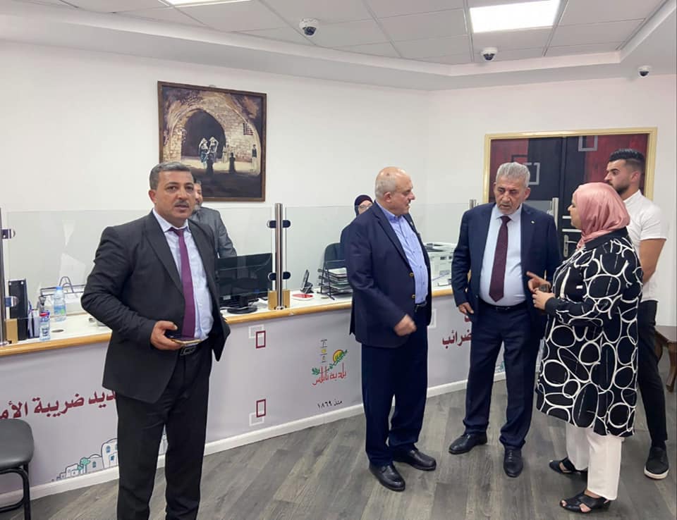 جانب من زيارة معالي وزير الحكم المحلي المهندس مجدي الصالح إلى مركز الجباية الغربي التابع لبلدية نابلس برفقة رئيس البلدية الدكتور سامي حجاوي ومدير عام مديرية الحكم المحلي في محافظة نابلس السيد رائد مقبل ومدير مكتب رئيس البلدية السيد مجدي الأتيرة.